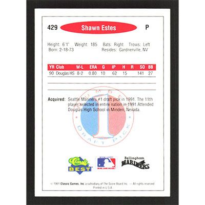 This is a 1991 Classic/Best Shawn Estes baseball card. The card is #429 and pictures show condition.
