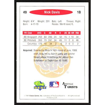 This is a 1991 Classic/Best Nick Davis baseball card. The card is #49 and pictures show condition.
