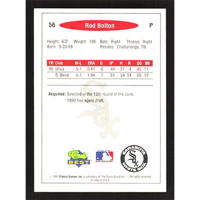 This is a 1991 Classic/Best Rod Bolton baseball card. The card is #56 and pictures show condition.