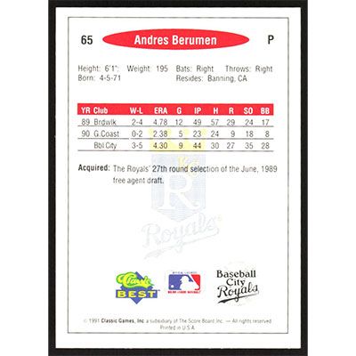 This is a 1991 Classic/Best Andres Berumen baseball card. The card is #65 and pictures show condition.