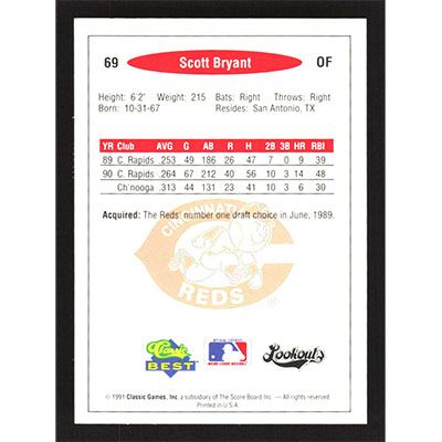 This is a 1991 Classic/Best Scott Bryant baseball card. The card is #69 and pictures show condition.
