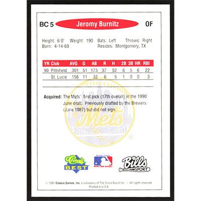 This is a 1991 Classic/Best Gold Bonus Jeromy Burnitz baseball card. The card is #BC5 and pictures show condition.