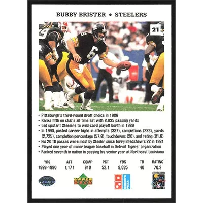 This is a 1991 Domino's Quarterbacks Bubby Brister football card. The card is #21 and pictures show condition.