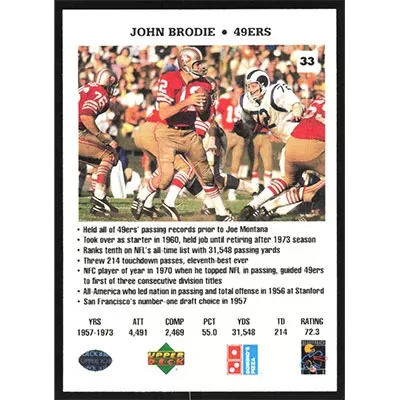 This is a 1991 Domino's Quarterbacks John Brodie football card. The card is #33 and pictures show condition.