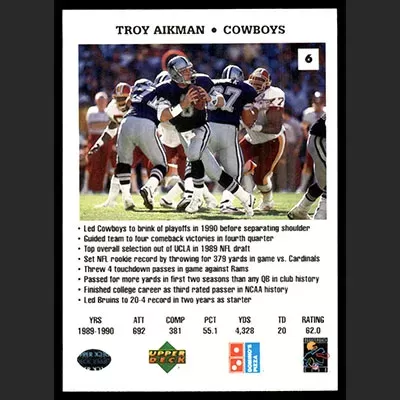 This is a 1991 Domino's The Quarterbacks Troy Aikman football card. The card is #6 and is in NM-MT condition.