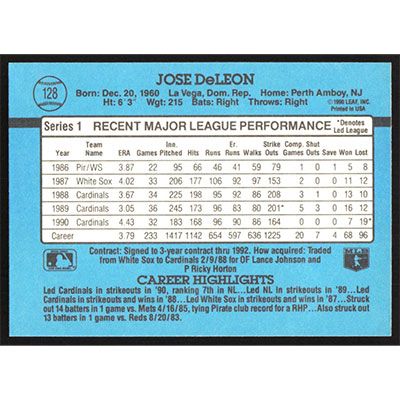 This is a 1991 Donruss Jose DeLeon baseball card. The card is #128 and pictures show condition.