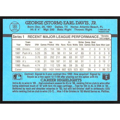 This is a 1991 Donruss Storm Davis baseball card. The card is #185 and pictures show condition.