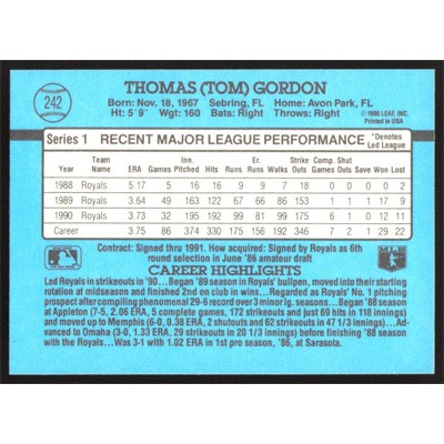 This is a 1991 Donruss Tom Gordon baseball card. The card is #242 and pictures show condition.