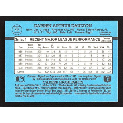This is a 1991 Donruss Darren Daulton baseball card. The card is #316 and pictures show condition.
