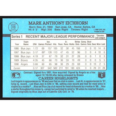 This is a 1991 Donruss Mark Eichhorn baseball card. The card is #318 and pictures show condition.