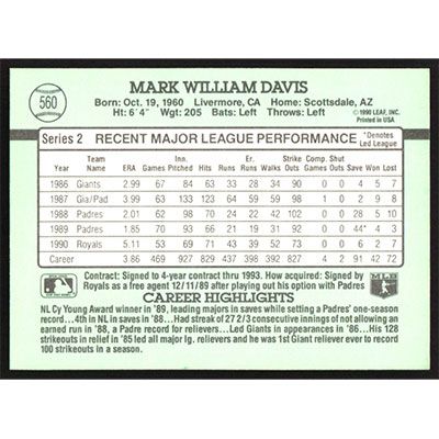 This is a 1991 Donruss Mark Davis baseball card. The card is #560 and pictures show condition.