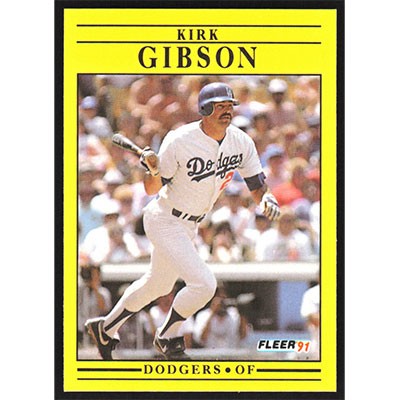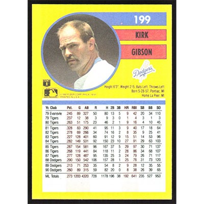 This is a 1991 Fleer Kirk Gibson baseball card. The card is #199 and pictures show condition.