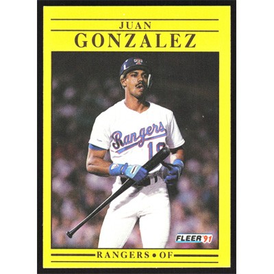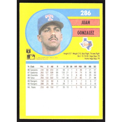 This is a 1991 Fleer Juan Gonzalez baseball card. The card is #286 and pictures show condition.
