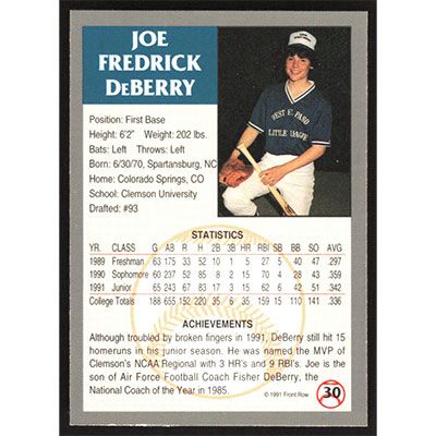 This is a 1991 Front Row Draft Picks Joe DeBerry baseball card. The card is #30 and pictures show condition.