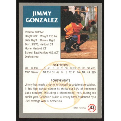 This is a 1991 Front Row Draft Picks Jimmy Gonzalez baseball card. The card is #32 and pictures show condition.