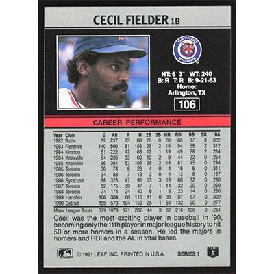 This is a 1991 Leaf Cecil Fielder baseball card. The card is #106 and pictures show condition.