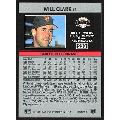 This is a 1991 Leaf Will Clark baseball card. The card is #238 and pictures show condition.