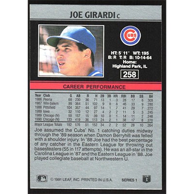 This is a 1991 Leaf Joe Girardi baseball card. The card is #258 and pictures show condition.