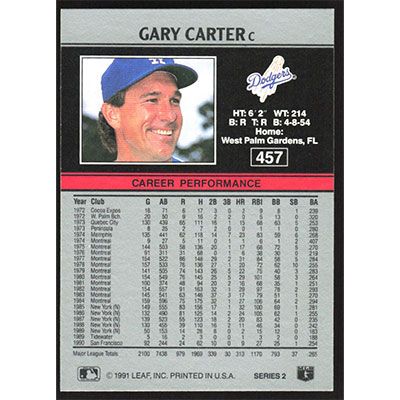 This is a 1991 Leaf Gary Carter baseball card. The card is #457 and pictures show condition.