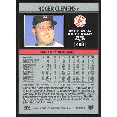 This is a 1991 Leaf Roger Clemens baseball card. The card is #488 and pictures show condition.