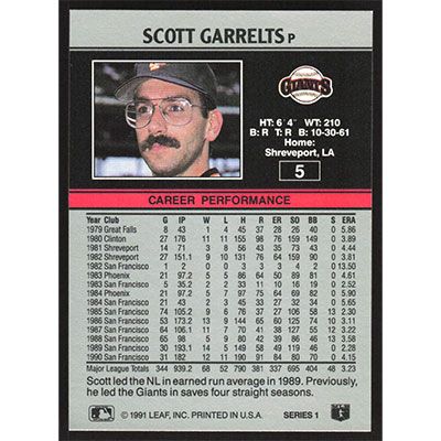 This is a 1991 Leaf Scott Garrelts baseball card. The card is #5 and pictures show condition.