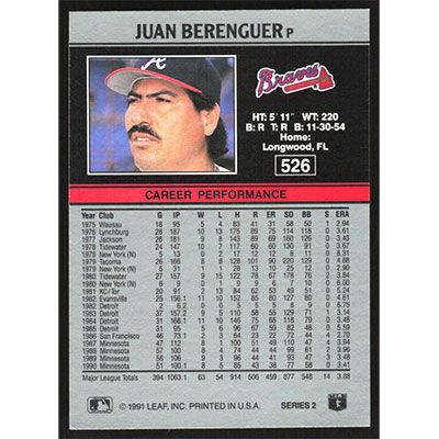 This is a 1991 Leaf Juan Berenguer baseball card. The card is #526 and pictures show condition.