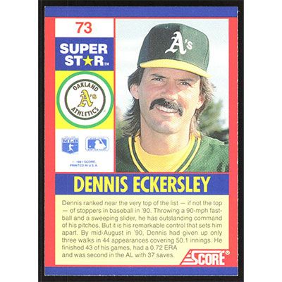 This is a 1991 Score 100 Superstars Dennis Eckersley baseball card. The card is #73 and pictures show condition.
