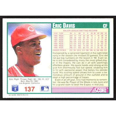 This is a 1991 Score Eric Davis baseball card. The card is #137 and pictures show condition.
