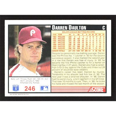 This is a 1991 Score Darren Daulton baseball card. The card is #246 and pictures show condition.
