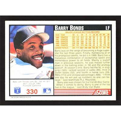 This is a 1991 Score Barry Bonds baseball card. The card is #330 and pictures show condition.