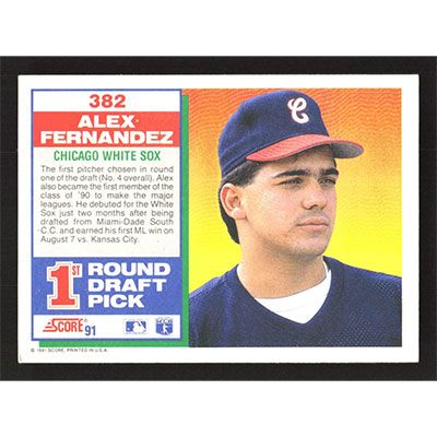 This is a 1991 Score Alex Fernandez First Round Draft Pick baseball card. The card is #382 and pictures show condition.