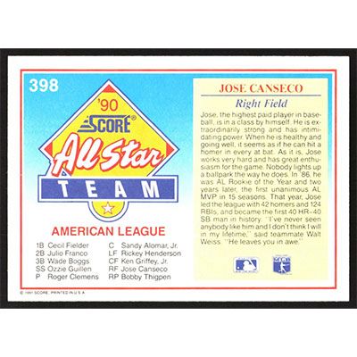 This is a 1991 Score Jose Canseco All-Star baseball card. The card is #398 and pictures show condition.