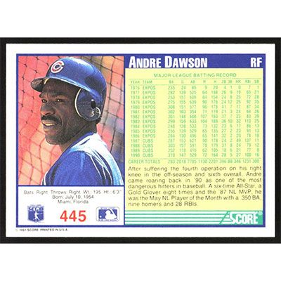 This is a 1991 Score Andre Dawson baseball card. The card is #445 and pictures show condition.