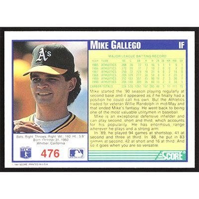 This is a 1991 Score Mike Gallego baseball card. The card is #476 and pictures show condition.