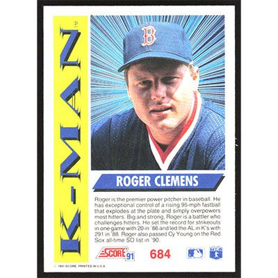 This is a 1991 Score Roger Clemens K-Man baseball card. The card is #684 and pictures show condition.
