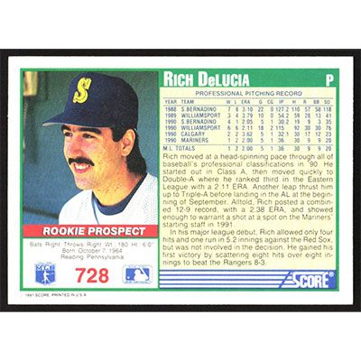 This is a 1991 Score Rich DeLucia baseball card. The card is #728 and pictures show condition.
