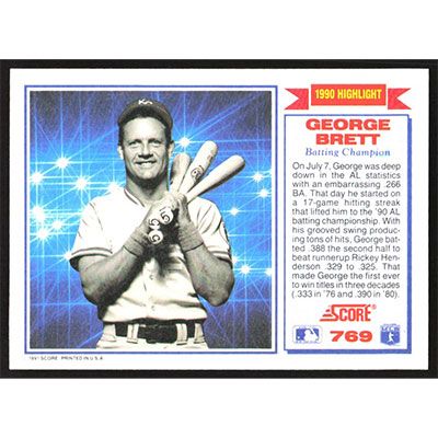 This is a 1991 Score George Brett Highlights baseball card. The card is #769 and pictures show condition.