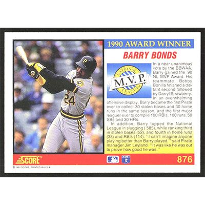 This is a 1991 Score Barry Bonds MVP baseball card. The card is #876 and pictures show condition.