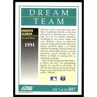 This is a 1991 Score Roberto Alomar Dream Team baseball card. The card is #887 and pictures show condition.