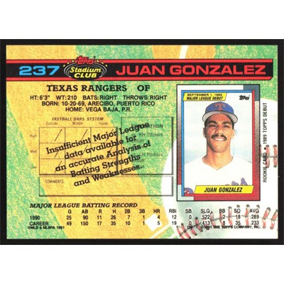 This is a 1991 Stadium Club Juan Gonzalez baseball card. The card is #237 and pictures show condition.