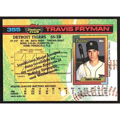 This is a 1991 Stadium Club Travis Fryman baseball card. The card is #355 and pictures show condition.