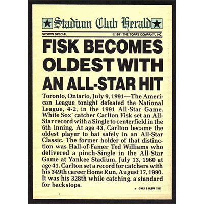 This is a 1991 Stadium Club Members Only Carlton Fisk baseball card. The card is #NNO and pictures show condition.