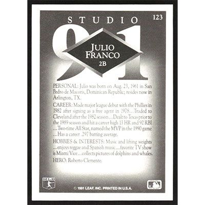 This is a 1991 Studio Julio Franco baseball card. The card is #123 and pictures show condition.
