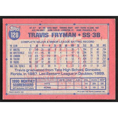 This is a 1991 Topps Travis Fryman baseball card. The card is #128 and pictures show condition.