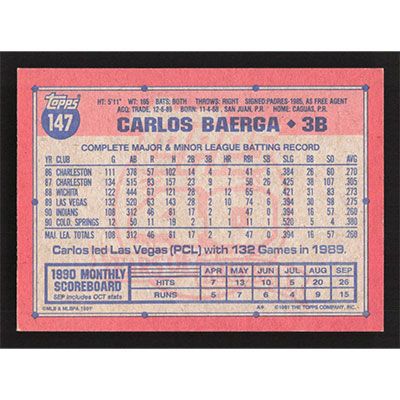 This is a 1991 Topps Carlos Baerga autographed baseball card. This card has been signed, in blue, by Carlos Baerga, and is guaranteed authentic by Ballcardz.com. The card is #147 and pictures show condition.