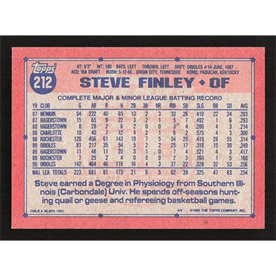 This is a 1991 Topps Steve Finley baseball card. The card is #212 and pictures show condition.