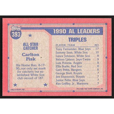 This is a 1991 Topps Carlton Fisk All-Star baseball card. The card is #393 and pictures show condition.