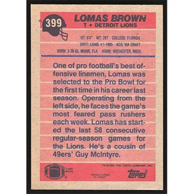 This is a 1991 Topps Lomas Brown football card. The card is #399 and pictures show condition.