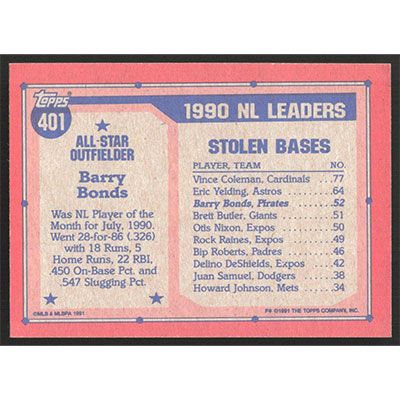 This is a 1991 Topps Barry Bonds All-Star baseball card. The card is #401 and pictures show condition.