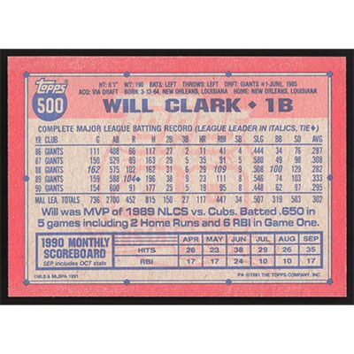 This is a 1991 Topps Will Clark baseball card. The card is #500 and pictures show condition.